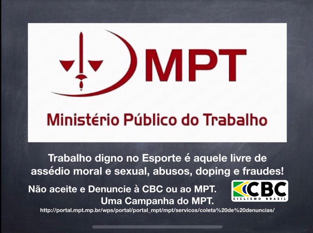 Diga não ao assédio moral e sexual, abusos, doping e fraudes. Entre em contato com a Confederação Brasileira de Ciclismo ou o Ministério Publico do Trabalho e denuncie!
