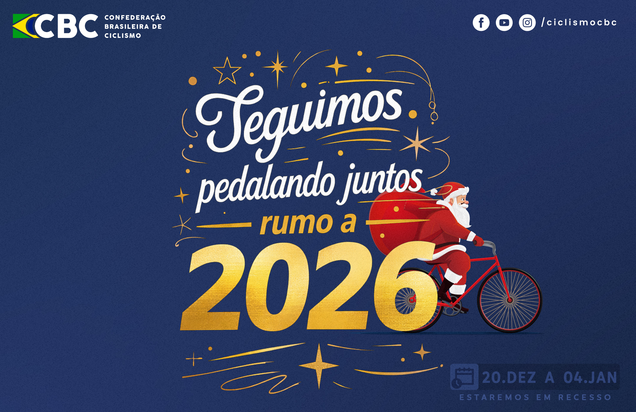 A Confederação Brasileira de Ciclismo (CBC) informa que entrará em recesso coletivo a partir do dia 20 de dezembro. As atividades administrativas da entidade serão retomadas normalmente no dia 5 de janeiro.